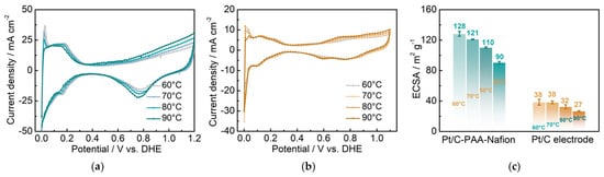 - Exploration of the influence of the ORR on the performance of DMFCs: From the results of Figure 5c, the DMFC assembled with the Pt/C–PAA–Nafion electrode demonstrates a smaller average ORR resistance (0.049 Ω cm2) from three measurements than the DMFC assembled with the conventional Pt/C electrode (0.088 Ω cm2). This indicates that the Pt/C–PAA–Nafion electrode exhibits excellent ORR activity even if the Pt loading (0.068 mg cm−2) is less than that of the conventional Pt/C electrode (0.078 mg cm−2). Given the effect of triple-phase boundary regions on the electrochemical reactions, the high ORR activity could be related to the macro/mesoscale hierarchical structures within the Pt/C–PAA–Nafion electrode. To explore the effect of the mesoscale hierarchical structures, CV measurements are conducted on DFMCs, as shown in Figure 8. From the CV curves in Figure 8a,b, all CV profiles demonstrate comparable hydrogen desorption/absorption peaks under 0~0.4 V vs. DHE, and the current density of these peaks decreases with the increasing testing temperature. This suggests that similar electrochemical reactions occur in the Pt/C–PAA–Nafion electrode and the conventional Pt/C electrode. Further, the average ECSA could be calculated based on the hydrogen-desorption peak, and the results are displayed in Figure 8c. Notably, the Pt/C–PAA–Nafion electrode exhibits a larger ECSA than that of the conventional Pt/C electrode under all testing temperatures, with an enhancement of 237%, 218%, 244%, and 233%, respectively. More electrochemical regions are provided in the Pt/C–PAA–Nafion electrode, and this improves the utilization of Pt/C electrocatalysts. At the same time, many researchers have evidenced the excellent oxygen-transport properties in the porous-nanofiber-network electrode. Hence, the Nafion/Pt triple-phase reaction regions formed by Pt/C electrocatalyst particles, the Nafion thin film, and the porous structures, together promote the outstanding ORR activity of the Pt/C–PAA–Nafion electrode. Hence, the output performance of DMFCs could be related to the effective triple-phase boundary regions within the Pt/C–PAA–Nafion electrode.