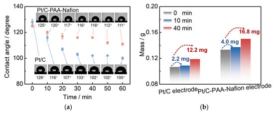 Contact angle of the Pt/C–PAA–Nafion electrode and the conventional Pt/C electrode (a); the mass of the methanol solution within the Pt/C–PAA–Nafion electrode and the conventional Pt/C electrode (b).