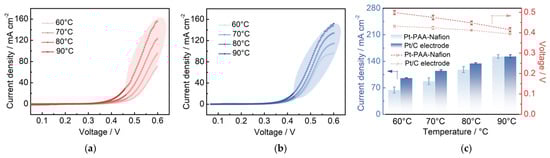 To further investigate the MOR activity in different cathodes, LSV characterization is carried out on the cathode of DMFCs, and the results are shown in Figure 11. The LSV profiles of one electrode reveal that the MOR current density increases notably with increasing testing temperature, which is attributed to enhanced methanol-crossover from the anode of DMFCs. At a fixed testing temperature, the MOR current density rises sharply above approximately 0.4 V, reaching a maximum at 0.6 V. From these LSV profiles, the MOR current density and overpotential are calculated, which are related to the MOR activity in the cathode. As summarized in Figure 11c, the DMFC assembled with the Pt/C–PAA–Nafion electrode exhibits a lower current density and higher overpotential, suggesting suppressed MOR activity within this electrode. This is despite a larger electrochemical surface area (ECSA) of the Pt/C–PAA–Nafion electrode compared to the conventional Pt/C electrode, which would otherwise suggest more available active sites for MOR. Given that electrochemical reactions are influenced by reactant concentration and mass transport processes, the partial suppression in MOR activity is likely governed by methanol-transport behavior within the Pt/C–PAA–Nafion electrode. Furthermore, the hierarchical architecture of continuous nanofibers and bead-like Pt/C–ionomer fibrous networks may partially obstruct methanol transport to the efficient triple-phase reaction regions. One possibility is that this physical restriction locally suppresses MOR activity by limiting methanol access. Alternatively, given the lack of direct-outlet analysis, the observed suppression in MOR activity may stem from enhanced methanol-permeability within the Pt/C–PAA–Nafion electrode, leading to a lower methanol concentration. Regardless of the dominant mechanism, both phenomena may contribute to a reduction in the impact of the methanol-crossover on the electrochemical properties of the cathode, thereby contributing to improved performance of the DMFC with the Pt/C–PAA–Nafion electrode.