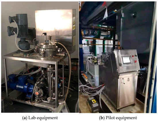 The experimental equipment was composed of a feed tank with stirring and heat exchange facilities, a pump (Zhejiang Alipu Technology Co., Ltd., Jinhua, China), RDF filter, permeate tank, pressure and temperature sensors (Shanghai Hengrui Measurement & Control Technology Co., Ltd., Shanghai, China), a flow meter (Wuxi Jingfan Automation Instrument Co., Ltd., Wuxi, China), valves, pipelines, and a control system. The key part of the system was the RDF filter, comprising a hollow shaft, membrane disc element, and pressure chamber (shown in Figure 2). The ceramic membrane elements from NOVOFLOW (Rain, Germany) were installed on the hollow shaft inside the chamber. The main parameters for each membrane element are listed in Table 1. The membrane rotation was driven by a variable-frequency motor connected to the shaft. As shown in Figure 3, both lab equipment (one 0.035 m2 membrane element, 2 L container volume) and pilot equipment (five 0.2 m2 membrane elements, 15 L container volume) were utilized. The rotational velocities were from 100 to 900 rpm in the lab tests and from 100 to 600 rpm in the pilot tests.