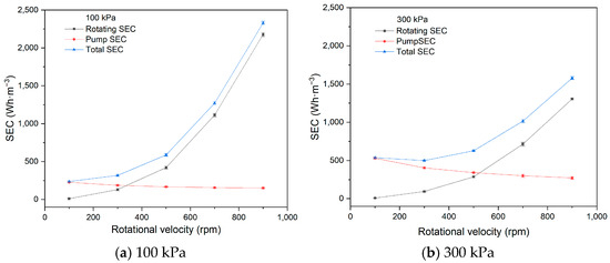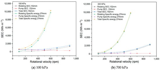 As depicted in Figure 4, the pump SEC decreases with increasing rotational velocity, while both the rotating SEC and total SEC increase at both 100 kPa and 300 kPa.