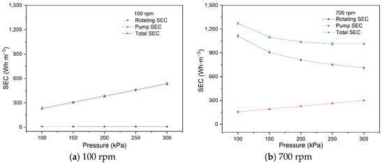 Figure 5 shows the relationship between SEC and operating pressure at 100 rpm and 700 rpm. At 100 rpm, the pump SEC is higher than the rotating SEC and increases with increasing operating pressure, while the rotating SEC decreases slightly. Therefore, the total SEC follows a similar trend to that of the pump SEC at 100 rpm. However, at 700 rpm, the rotating SEC is higher than the pump SEC and decreases as operating pressure increases. The total SEC is primarily determined by the rotating SEC and decreases with increasing operating pressure.