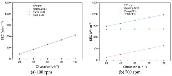 As shown in Figure 6, the SEC with varying circulation flow exhibits similar patterns at both 100 rpm and 700 rpm.