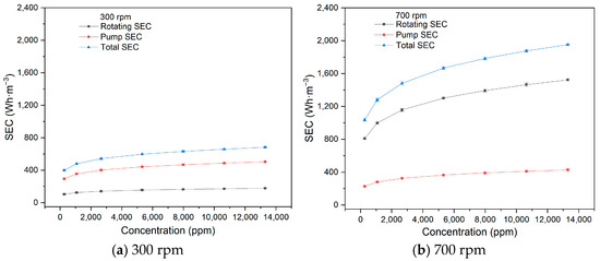 The effect of feed concentration on SEC was investigated at a feed circulation flow rate of 60 L·h−1, a temperature of 20 °C, an operating pressure of 200 kPa, and rotational velocities of 300 rpm and 700 rpm, using the 1# membrane element. The fluxes with different concentrations are shown in Table 5.