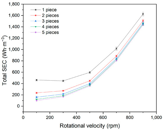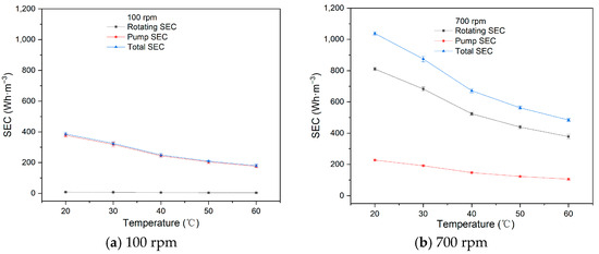 As shown in Figure 8, the pump SEC, rotating SEC, and total SEC all decrease with increasing temperature at both 100 rpm and 700 rpm. The total SEC decreases from 386.37 Wh·m−3 at 20 °C to 180.11 Wh·m−3 at 60 °C at 100 rpm, and from 1038.37 Wh·m−3 at 20 °C to 484.05 Wh·m−3 at 60 °C at 700 rpm.