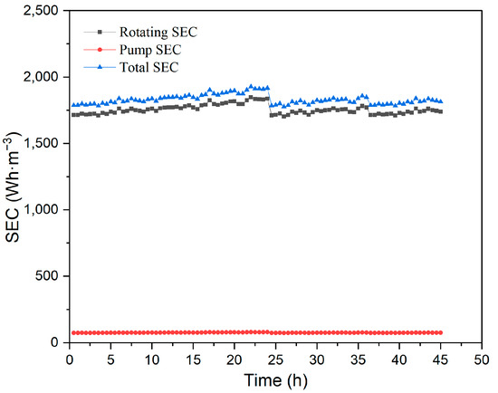 As shown in Figure 11, the pump SEC, rotating SEC, and total SEC remained stable throughout the pilot experiment, with the rotating SEC accounting for a large proportion of the total SEC. The average total SEC was 1830.86 Wh·m−3. If membrane fouling becomes more severe in actual application, the flux will fall, while the SEC will increase.