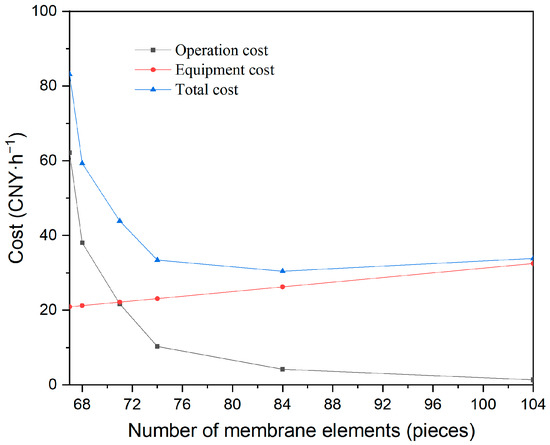 The reference electricity price of CNY 2 per kWh was based on shipboard operating scenarios; the membrane cost of CNY 50,000 per square meter of membrane was estimated based on engineering experience. A 4-year service life and an annual operation time of 8000 h are the general requirements of customers. Moreover, there is almost no scaling effect for the sake of the same-sized membrane used.