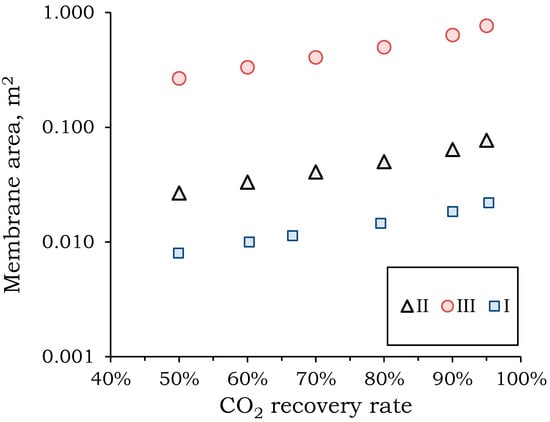 The recovery rate and pressure mode directly affect the required membrane area. The relationship between the required area and CO2 recovery for different pressure modes is illustrated in Figure 5.