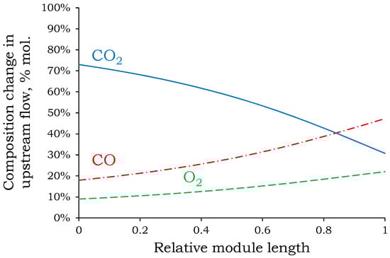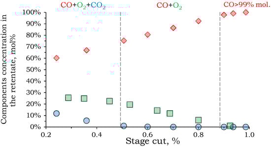 When modeling the second stage, we assumed that there was no pressure loss of the feed flow along the length of the module in the first stage (10 bar). The calculation criterion was to achieve a purity of 99 mol% for the target component (CO) in the retentate. The concentrations of CO, O2, and CO2 as a function of the recovery rate are shown in Figure 7.