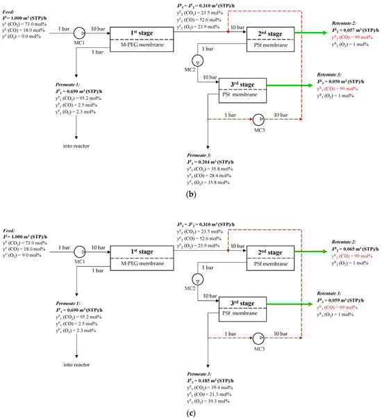 M-PEG membrane demonstrates high ideal selectivity: 14.5 and 29.1 for CO2/O2 and CO2/CO, respectively. Thus, CO2 will preferentially be transported through the membrane. The CO:O2 ratio in the retentate is expected to vary depending on the initial mixture that is being separated. The CO2 permeability of the obtained M-PEG membrane is comparable to the permeability of the commercial Polaris membrane from MTR, which is 1000 GPU [96]. The CO2/CO selectivity of the obtained M-PEG membrane (29.1) is not inferior to membranes based on PEBAX (8–30) [86,97,98,99]. It is worth noting that the M-PEG permeability coefficient for CO2 is 1300 Barrer, while the PEBAX permeability coefficients are 8–350 Barrer [86,97,98,99]. In this regard, the M-PEG membrane seems promising for CO2 recovery from the CO2 plasmolysis product mixture and was adopted as a basis for further modeling of the separation process.