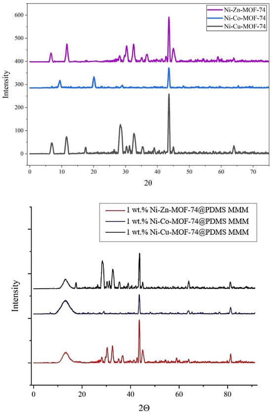 X-ray diffraction (XRD) was used to study the structure of PDMS-based mixed matrix membranes containing Ni-Cu-MOF-74, Ni-Zn-MOF-74, and Ni-Co-MOF-74 at a loading of 1 wt.% relative to PDMS. The diffraction patterns of the membranes show the characteristic MOF peaks superimposed on the broad amorphous halo of the PDMS phase, confirming that the crystalline fillers were successfully incorporated into the polymer matrix. The MOFs retain their signature reflections at higher 2θ values, corresponding to their well-defined crystalline planes and consistent with the reported structures of the respective frameworks. The persistence of these peaks after incorporation indicates that the MOF crystallinity is preserved within the PDMS matrix. Thus, the membranes consist of an amorphous PDMS phase containing dispersed crystalline MOF domains. This combination is expected to favour gas separation by coupling the molecular sieving behaviour of the MOFs with the intrinsic permeation characteristics of PDMS, making these MMMs suitable candidates for CO2 capture applications.