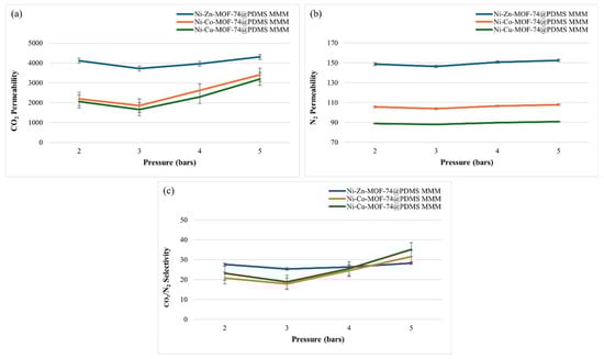 In Figure 6a, the CO2 permeability of the MMMs containing Ni-Cu-MOF-74, Ni-Co-MOF-74, and Ni-Zn-MOF-74 generally increases with feed pressure, with a small decrease at 3 bar. This deviation is consistent with swelling and sorption effects in the PDMS phase, which can temporarily hinder gas transport [50]. Among the samples, the Ni-Zn-MOF-74-based MMM shows the highest CO2 permeability. This behaviour is associated with weaker framework–gas interactions and the slightly enlarged pore structure induced by Zn2+ incorporation, which reduces metal-ligand bond strength and promotes faster gas diffusion through the membrane [51,52,53]. The N2 permeability data in Figure 6b follow a similar pressure dependence, including a dip at 3 bar, and again the Ni-Zn-MOF-74 MMM exhibits the highest values, consistent with its larger effective pore size. The resulting CO2/N2 selectivities are plotted in Figure 6c. The 1 wt.% Ni-Cu-MOF-74@PDMS membrane achieves the highest selectivity, with a value of 35.10. Favourable interfacial interactions between the MOF fillers and the PDMS phase lead to a dense, defect-free morphology in the Ni-Cu-MOF-74-based MMM [54]. This good contact at the filler–polymer interface promotes more effective, selective transport pathways for CO2, as reflected in the high separation performance. By contrast, the Ni-Zn-MOF-74 MMM, although showing the highest CO2 permeability, exhibits the lowest CO2/N2 selectivity, illustrating the typical permeability–selectivity compromise observed in polymer-based MMMs [55]. Considering both parameters, the Ni-Cu-MOF-74@PDMS membrane offers the most favourable combination, with a CO2 permeability of 3188.25 Barrer and a CO2/N2 selectivity of 35.10, and is therefore identified as the best-performing composition in this work.