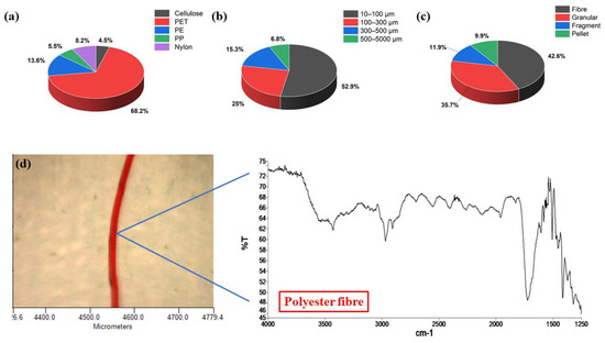 Occurrence and distribution of MPs in the raw domestic laundry wastewater. (a) Polymer types of MPs; (b) MP sizes; (c) MP shapes; (d) spectrum, shape, and colour of a typical PET fibre.