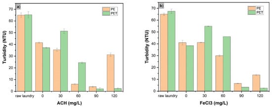 Turbidity of high-strength MP laundry wastewater at various coagulant dosages: (a) ACH and (b) FeCl3.