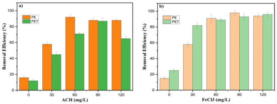 Removal efficiencies of PS and PE MPs at various coagulant dosages of PAC and FeCl3: (a) ACH and (b) FeCl3; [PET]o = 100 mg/L, [PE]o = 100 mg/L.