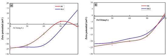 With ACH as the coagulant, the zeta potential of laundry wastewater with high PE and PET crossed the zero point at 90 mg/L and 120 mg/L, respectively (see Figure 4a). The final zeta potential in the PE-ACH system was closer to zero compared to the PET-ACH system, indicating that charge neutralization was more effective in the PE-ACH system. However, in addition to MPs, household laundry wastewater contains a variety of charged components [14]. Indicated here is that charge neutralization alone does not account for the removal efficiencies of PS and PE.
