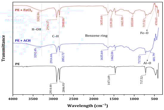 When comparing the FTIR spectra of PE before and after coagulation in this study, additional peaks were observed after coagulation (Figure 5). Notably, the prominent peaks around 2915 and 2850 cm−1 were attributed to CH2 asymmetric and symmetric stretching, respectively [29,32]. The peak around 3435 cm−1 was assigned to O-H bond stretching, while the peak at 1729 cm−1 was attributed to C=O stretching [33]. The peaks at approximately 1409, 1505, and 1631 cm−1 were attributed to substitutions on the benzene ring [33,34].