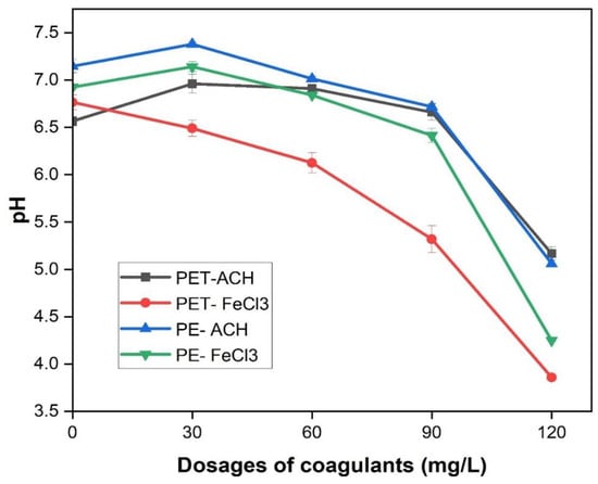 The initial pH of domestic laundry wastewater with high MP strength ranged from 6.99 to 7.24. These figures tended to decrease when the Jar Test process began. As can be seen from Figure 6, the pH continues to decrease significantly as the concentration of coagulants increases. The coagulant FeCl3 led to a greater reduction in the pH of the laundry wastewater compared to the coagulant ACH. Notably, in laundry wastewater with a high strength of PET MPs, the pH decreased from 6.88 to 3.86 when the FeCl3 coagulant was used at a concentration of 120 mg/L. In contrast, the ACH coagulant had less impact on the pH of the laundry wastewater. Specifically, the pH only decreased from 7.0 to 5.1 for laundry wastewater with high strength of PE and PET MPs (see Figure 6). According to a previous study, a small change in the pH of wastewater could lead to a significant impact on the efficiency of the coagulation process [38]. Therefore, ACH, a coagulant that had less impact on the pH, can be prioritized for coagulation in laundry wastewater.