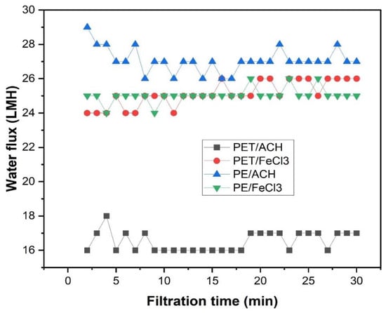 A major factor restricting the widespread usage of membranes is fouling, which results in significant membrane flux reduction. This will necessitate more cleaning chemicals [40]. Initial experimental results show a promising outcome for all four types of influent samples: laundry water samples with high concentrations of PE and PET, which were pre-treated with ACH and FeCl3 coagulants at optimal doses (Figure 7).
