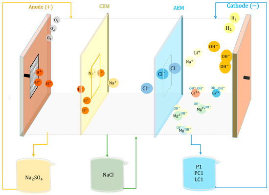 Díaz Nieto et al. [32] propose electrodialysis with membranes as an alternative for the removal of divalent cations from brines sourced from the Salar del Hombre Muerto in northern Argentina. In the cathodic compartment, natural brine (initial composition: 0.309% Mg and 0.068% Ca) is added, where Mg(OH)2 and Ca(OH)2 precipitate. In the anodic compartment, HCl is used, and a phosphate buffer solution is added, adjusted with NaOH to maintain a pH of 10, ensuring that the Cl2 formed is disproportionated into Cl and ClO−. For studies with Li concentrations of 0.13%, 0.059%, and 0.127 ppm, with Mg/Li ratios of 2.4, 4.6, and 6.9, respectively, the lowest energy consumption was 62 kWh/m3 of brine for the complete removal of both cations to concentrations lower than 2 ppm. Similarly, Pan et al. [33] proposed an electrochemical method to separate and extract Mg and Li from brines. In this method, the brine with an Mg/Li ratio of 98.23 enters the anodic compartment and the Mg2+ cations migrate to the cathodic compartment where Mg(OH)2 precipitates. Part of the lithium migrates with magnesium, enriching the catholyte, while the rest of the Li remains in the anolyte, forming a lithium-rich liquid with a low Mg/Li ratio. Through multistage electrolysis, the Mg/Li ratio can be reduced from 98 to 0.17, achieving final concentrations of 0.026 g/L of Mg and 0.15 g/L of Li. This method allows for an excellent reduction of the Mg/Li ratio from 98.23 to 0.17.