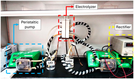 Table 3 presents the test setup for the PC2 solution; the conditions that yielded the best results will be replicated with the LC2 solution for comparative purposes. Figure 3 shows the schematic of the electrolysis process, where the cathodic compartment contains 0.5% by mass LiOH solution and the anodic compartment contains the LiCl solution (PC2 or LC2). The cationic membrane allows the passage of positive cations (Li+, Na+, and K+) from the anolyte to the catholyte. At the anode, H+ protons, O2 gas, and Cl2 gas are generated, while at the cathode, OH⁻ is produced by the reduction of water. In this way, monovalent cations migrate to the cathodic compartment to form LiOH, NaOH, and KOH. The membrane has an area of 30 cm2 and the surface area of the electrodes is 31.5 cm2.