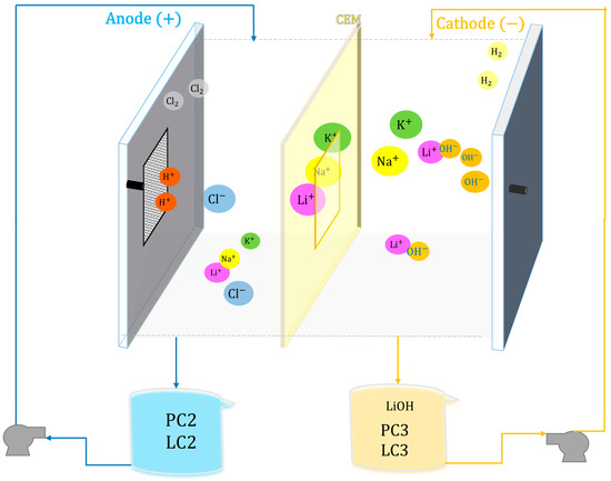 - Third Stage: The best result from the second stage was further worked with, evaluating the selectivity of the Na⁺ and K⁺ impurities still present alongside the Li⁺ ion. A commercial cationic membrane Nafion 117 (DuPont Co., Wilmington, DE, USA) and a monovalent selective cationic membrane Neosepta CMS (ASTOM Co., Tokyo, Japan) were used in a membrane electrolytic reactor prototype. The LiCl feed solution (PC2 and LC2) would serve as the anolyte, and the resulting LiOH solution would serve as the catholyte (PC3 and LC3), allowing for the evaluation of Li recovery and specific energy consumption.