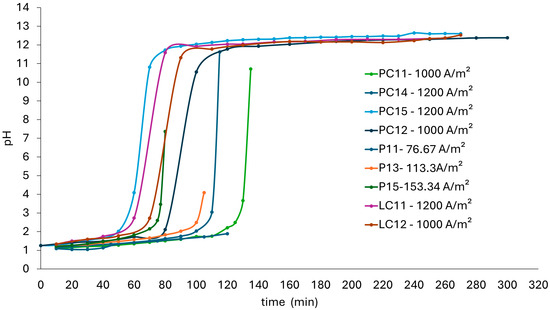 The operation time increased when lower current density values were used, indicating that reaching a higher pH requires more time for electrolyte recirculation, which increases the energy required for pumping.