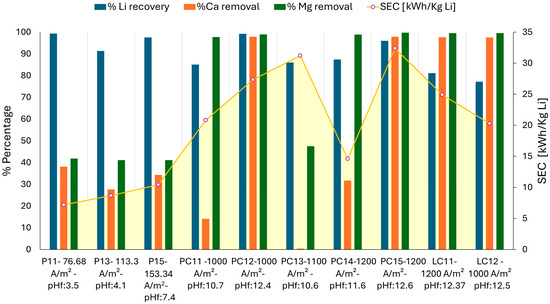 For the concentrated solutions PC1 and LC1, the lithium recovery percentage was higher at a pH above 12. This was because the surface charge of Mg(OH)2 remained positive up to this pH [32,35], at which point it became neutral, releasing previously adsorbed ions such as Cl⁻, which may have been associated with Li⁺ ions. The PC12 and PC15 tests, at 1000 and 1200 A/m2, respectively, reached a pH of 12 with removal efficiencies exceeding 99% for Mg and 98% for Ca. The specific energy consumption for the removal of both cations was lower in PC12, with a value of 27.33 kWh/kg Li.