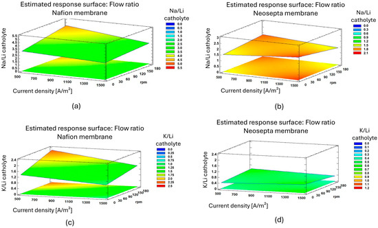 The analysis of variance (ANOVA) supported the results obtained for the K/Li ratio, identifying the membrane type as the only factor with a significant effect (p = 0.0334, F = 13.98). Flow rate (B) had a trend towards significance (p = 0.0982) while current density (A) and its interactions did not reach statistical significance, which was consistent with what was reported by Saracco [45] for the Neosepta CMS membrane. The model explained 90.7% of the variability (R2). On the other hand, the analysis of variance (ANOVA) for the Na/Li ratio indicated that none of the factors had a significant effect (p > 0.05). Membrane type (C) had the greatest relative impact (F-Ratio = 6.41, p = 0.0853), followed by current density (B) (F-Ratio = 3.98, p = 0.1398). The model explained 86.2% of the variability (R2), with an adjusted R2 of 58.6%. Overall, membrane type appeared to be the most relevant factor for future investigations.