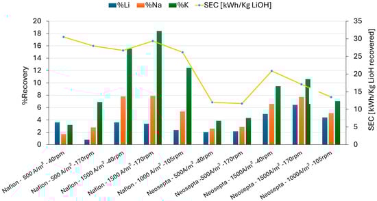 The Li recovery with the Neosepta CMS membrane exceeded twice that obtained with Nafion 117. The recovery values obtained for Nafion 117 reached a maximum of 3.6% Li, with a specific energy consumption (CEE) of 29.36 kWh/KgLiOH, while for Neosepta CMS, the recovery was 6.44% Li with a CEE of 6.09 kWh/KgLiOH (Figure 7).