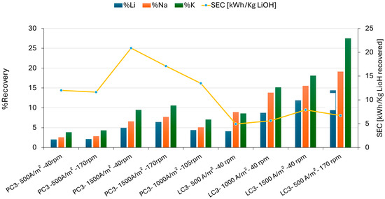 Although the initial composition in the anolyte LC2 had a lower impurity content compared to lithium, the migration rate of K+ predominated due to its smaller hydrated radius, which provided it with greater mobility within the solution. Through the membrane, a recovery of 27–53% for K+ was achieved, compared to only 14.43% for Li, with a specific energy consumption (CEE) of 6.70 kWh/KgLiOH (Test LC3). As shown in Figure 8, lithium recovery was higher at a low current density (500 A/m2) and high flow (170 rpm), indicating that the migration of Li was favored by convection transport due to the flow speed applied to the electrolyte. The Neosepta CMS membrane showed better lithium recoveries in the LC3 solution. With an initial concentration of Li and a lower concentration of impurities in LC2 (anolyte), the resulting solution in the catholyte LC3 had 14.44% Li recovered, compared to the 6.4% Li obtained in PC3.