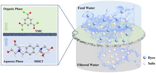 Synthetic dyes, as indispensable raw materials, have permeated a myriad of industries, playing an important role in various industries such as rubber production, textile manufacturing, leather tanning, cosmetics formulation, and pharmaceutical development [,,]. Globally, the annual consumption of synthetic dyes surpasses an astounding 700,000 tons, with the textile sector claiming over half of this substantial quantity [,]. Desalination is a critical process in dye production, where inorganic salts such as Na2SO4, MgSO4, NaCl, MgCl2, etc., serve as essential additives. However, inorganic salts at concentrations as high as 30% pose a significant challenge to achieving high-purity dyes [,]. Traditional purification technologies, such as evaporation and solvent extraction, demand substantial energy consumption and solvent usage, leading to high costs and inefficiencies [,]. Membrane technology represents a promising candidate due to its lower energy consumption for separation processes and the absence of chemical or biological changes to the products [,].