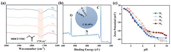 (a) FTIR spectra and (b) XPS spectra of MDET-TFC TFCMs. (c) Surface zeta potential of MDET-TMC TFC membranes.
