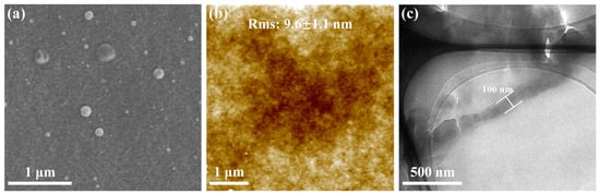 TFC membranes were fabricated via an IP reaction on polysulfone substrates. As shown in Figure 4a, the MDET-TMC TFC membrane exhibits a relatively smooth surface, which was further confirmed by AFM (Figure 4b) analysis, revealing a surface roughness of 9.6 ± 1.1 nm. Lower roughness is advantageous for minimizing the adhesion of pollutants to the membrane surface. High-resolution TEM analysis of the ultrathin slice-treated membrane indicated that the MDET-TMC polyester selective layer has a uniform thickness of approximately 106 nm.