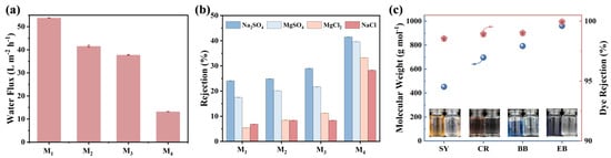 (a) Water flux, (b) single salt rejection, and (c) single dye rejection of the M3 membrane. The operating pressure is 5 bar, and the concentrations of the single salt solution and the single dye solution are 1000 mg/L and 50 mg/L, respectively.