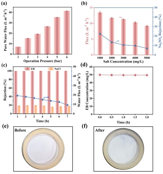 (a) Operation pressure in pure water flux and (b) Na2SO4 rejection of M3 membranes (1000 mg/L Na2SO4 as feed solution). (c) Separation of EB/NaCl mixed solution (EB: 50 mg/L, NaCl: 1000 mg/L) using M3 membranes. (d) EB concentration in feed during two-hour operation (EB: 50 mg/L). Picture shows membrane top surface (e) before and (f) after 7 h of EB filtration.