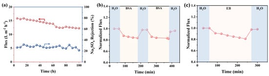 The membrane antifouling performance was tested using BSA (100 mg/L) solution and EB (50 mg/L) solution as representative pollutants. Initially, the membrane was conditioned by filtering distilled (DI) water for 60 min at 5 bar to achieve a steady state, and pure water flux was recorded every 30 min as . Afterward, the ultrapure water was replaced with the BSA solution or EB solution to perform the anti-fouling experiment. In each cycle for continuous filtration with BSA or EB pollutant, the flux for BSA or EB solution was recorded as . Finally, the polluted membrane was flushed with DI water for 60 min and the recovered water flux after cleaning the membrane was denoted as . The correlation indices for antifouling properties were calculated using Equation (4) and Equation (5), respectively: