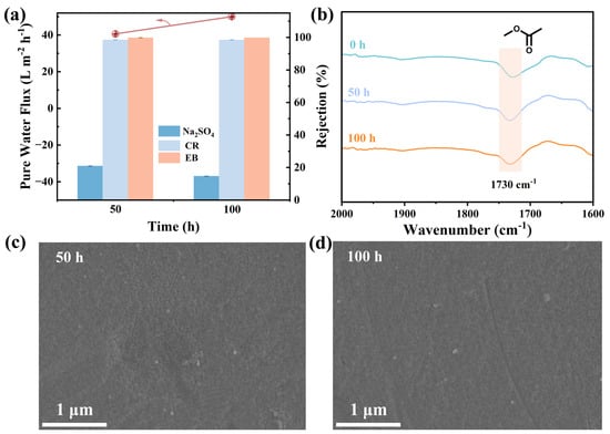 Chlorine resistance of M3 exposed to NaClO (500 mg/L, pH = 7) aqueous solution. (a) Separation performance including water flux and salt and dye rejection. (b) FT-IR spectra. SEM images of the top surface after (c) 50 h and (d) 100 h (the concentrations of the single salt solution and the single dye solution are 1000 mg/L and 50 mg/L, respectively).