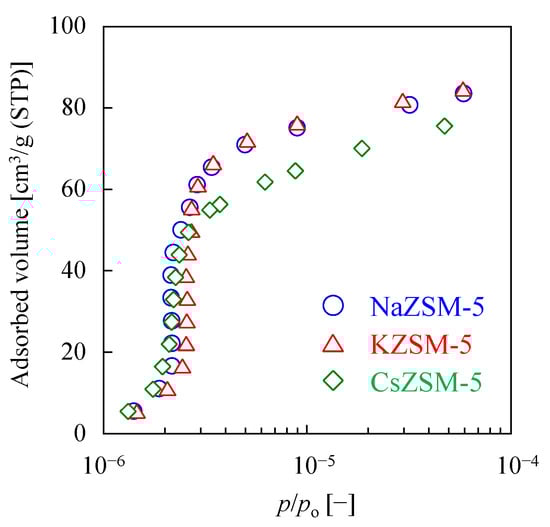 Argon adsorption measurements were taken for the three types of ZSM-5 powder to discuss the effect of cation on micropore volume. Figure 2 shows the Ar adsorption isotherms for p/po values between 10−6 and 10−4. According to the Saito–Floy (SF) method, the value of 1 × 10−5 for p/po corresponds to a pore size of about 0.55 nm, which was the typical pore size for the MFI structure. The Ar adsorption capacity of the CsZSM-5 powder at p/po = 0.9 × 10−5 was 65 cm3/g (STP), which was about 85% of that of NaZSM-5. We confirmed a decrease of the micropore volume by exchanging the cation, from Na+ to larger Cs+. This result also suggests that the effective pore size would have decreased where the Cs+ is present. Although the ionic radius of K is larger than that of Na, a significant difference was not observed between the adsorption isotherms of the KZSM-5 and the NaZSM-5 powder. This would be due to (1) the small difference in size between K+ and Na+ compared to Cs+, and (2) the cation content of NaZSM-5. For these two reasons, the cation exchange to K+ would have made little effect on the micropore volume.