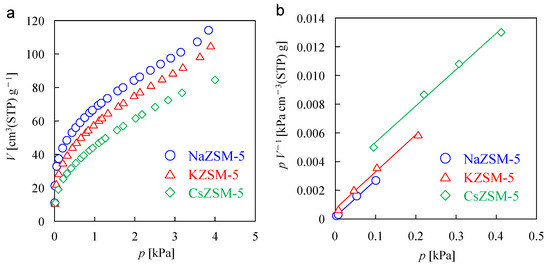 where V (cm3(STP) g−1) is the quantity of adsorbed H2O at a specified pressure of p (kPa). K (kPa−1) and Vs (cm3(STP) g−1) are the Langmuir equilibrium constant and the saturated adsorption quantity, respectively. All isotherms exhibited linear relationships between p V−1 and p in the low range of H2O pressure, as shown in Figure 3b and Figure S5. Therefore, Vs and K can be calculated from the slope and intercept. Table 2 lists the calculated Vs values. With the exception of the value for NaZSM-5 at 343 K, similar values were obtained regardless of cation and measurement temperature. Different from the result of Ar adsorption measurements (Figure 2), the obtained results indicate that there is no significant difference in microporosity due to cations in the steam adsorption. The difference in (1) molecular size between H2O and Ar and (2) the cation content of ZSM-5 would have contributed to the difference in the effect of cations in the two adsorption measurements. The higher Vs value for the NaZSM-5 at 343 K would be due to the lower correlation between p V−1 and p than for the other two temperatures.