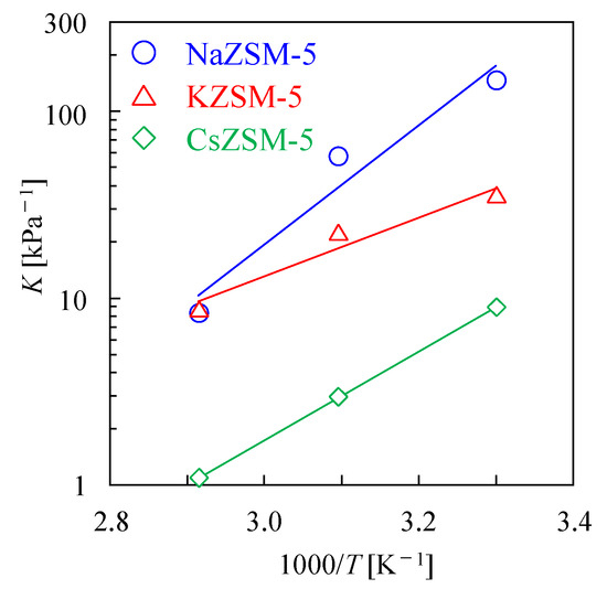 where R (J K−1 mol−1) and T (K) are the gas constant and adsorption temperature, respectively. Therefore, the values of ΔH can be determined from the slope shown in Figure 4. The calculated values of ΔH from this and previous studies are listed in Table 3. In a previous study, ΔH values of −113 and −75 kJ mol−1 were determined for H+-type ZSM-5 (HZSM-5) with Si/Al ratios of 38 and 250, respectively, using thermogravimetric analyses [32]. Bolis et al. assessed the ΔH values of HZSM-5 (Si/Al ratios of 3.8) and silicate-1 using microcalorimetry. The values for HZSM-5 and silicate-1 ranged between −69 and −84 kJ mol−1 and between −61 and −68 kJ mol−1, respectively [33]. Ohlin et al. used attenuated total reflectance Fourier-transform infrared (ATR-FTIR) spectroscopy on NaZSM-5 films with a Si/Al ratio of 130 [34]. The ΔH values of the pore wall, and defects in the form of silanol groups and/or sites containing Na+ were −72 and −58 kJ mol−1, respectively. The NaZSM-5 powder used in this study exhibited a Si/Al ratio and ΔH value of 23 and −61 kJ mol−1, respectively. As mentioned above, the objective of the ΔH calculation is to discuss the change of ΔH values with cation. Although the Al content of NaZSM-5 and the measurement method differed from previous studies, the ΔH value was similar to those observed in previous studies.