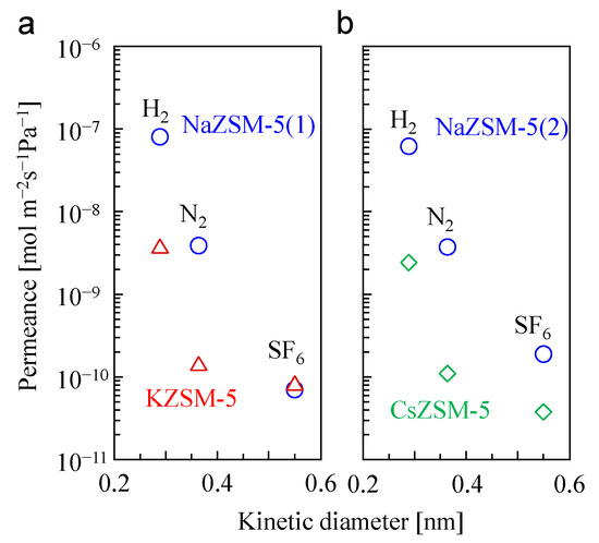 The permeance values of H2 and N2 via the KZSM-5 membrane were approximately 4.8 and 2.9% of those of NaZSM-5 membrane (1), respectively. The H2 and N2 permeances of the CsZSM5 membrane were approximately 3.9 and 3.7% of those of the NaZSM-5 membrane (2), respectively. The ideal permselectivities for N2/SF6 via KZSM-5 and CsZSM-5 were 2 and 3, respectively, indicating that neither membrane exhibited molecular sieving properties for the two gases. In contrast, the permselectivity for H2/N2 marginally increased after cation exchange. These results indicate that cation exchange from Na+ to K+ and Cs+ resulted in a reduction in the micropore volume of the ZSM-5 membrane; additionally, the effective zeolitic pore size was reduced to approximately 0.36 nm, which is similar to the kinetic diameter of N2. Kinetic diameters of H2 and Ar are close to those of H2O and N2, respectively. Compared to the results of Ar and steam adsorption measurements (Figure 2 and Table 2), the effect of cation exchange on micropore volume and pore size was greater on the membranes than on the powders. This behavior was related to the morphology of the membrane. The synthesized ZSM-5 membrane had a polycrystalline structure (Figure 1c), which results in a disconnection of the micropores at the grain boundary, leading to a reduction in the micropore volume and effective zeolitic pore size [36]. The unique structure of the ZSM-5 membrane resulted in a cation exchange effect, which differed from that observed in the Ar and steam adsorption measurements using the ZSM-5 powder.