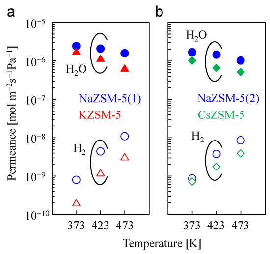 Figure 6 shows the temperature dependence of H2O and H2 permeances in the binary mixture system. The separation tests were performed at an H2O partial pressure of 3.2 kPa. Although the H2O permeance decreased after cation exchange, the KZSM-5 and CsZSM-5 membranes exhibited selective permeation of H2O over H2 at temperatures ranging from 373 to 473 K, similar to the NaZSM-5 membranes.