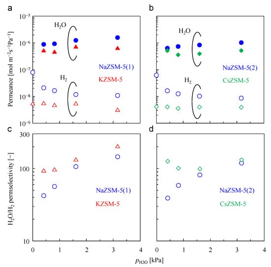 Next, the effect of the H2O partial pressure in the feed stream on the permeation and separation performances of the ZSM-5 membranes before and after cation exchange was evaluated (Figure 7). For the NaZSM-5 membranes, H2O permeance slightly increased with increasing H2O partial pressure. However, the H2 permeance decreased with increasing H2O partial pressure, resulting in an increase in the H2O/H2 permselectivity. An increase in the H2O partial pressure increased the quantity of H2O adsorbed onto the membranes, which facilitated H2O permeation and inhibition of H2 permeation.