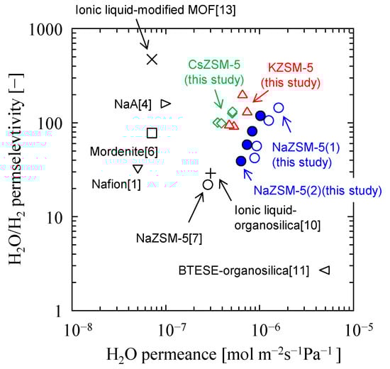 Steam permeances and H2O/H2 permselectvity of the NaZSM-5 membranes were higher than those of other membranes. The superior performance of the NaZSM-5 membranes can be attributed to their very few defects and support Al2O3 thickness. As mentioned above, H2O/H2 permselectivity increased after the cation exchange. Narrowing the effective zeolitic pore size via the cation exchange can be attributed to the enhancement of inhibition of H2 permeation. Cation exchange with K+ and Cs+ is a simple and effective approach for improving H2O permselectivity.