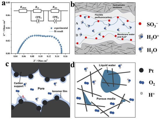 (a) EIS of PEMFC and equivalent circuit, (b) proton conduction mechanism, (c) three-phase reaction interface of cathode CL, and (d) oxygen transport in porous media.