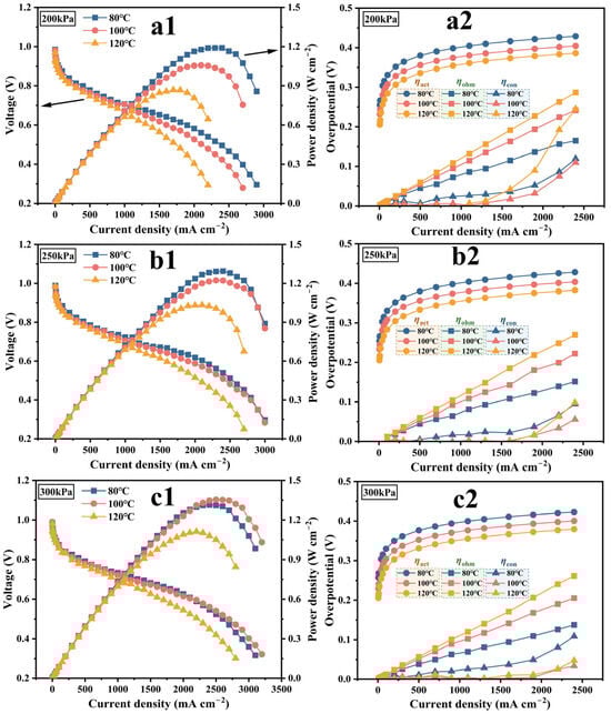 The polarization and power density curves of the PEMFC composed of Gore12, operating from 80 °C to 120 °C at 43% relative humidity (RH), are depicted in Figure 3a1–c1. It is obvious that back pressure significantly influences the performance of the PEMFC. As the back pressure increases, the performance difference between adjacent temperatures gradually decreases. Especially at 300 kPa, the performance at 80 °C and 100 °C intersect. At constant temperatures, the performance improves with higher back pressure, especially at elevated temperatures. At a current density of 2000 mA·cm−2, when the back pressure is increased from 200 kPa to 300 kPa, the performance of the PEMFC at 80 °C, 100 °C, and 120 °C is increased by 0.045 V, 0.088 V, and 0.142 V, respectively. To further analyze the internal root causes of the performance differences of the PEMFC operating under various conditions, polarization curves were decomposed according to Equations (S2)–(S9), as depicted in Figure 3a2–c2.