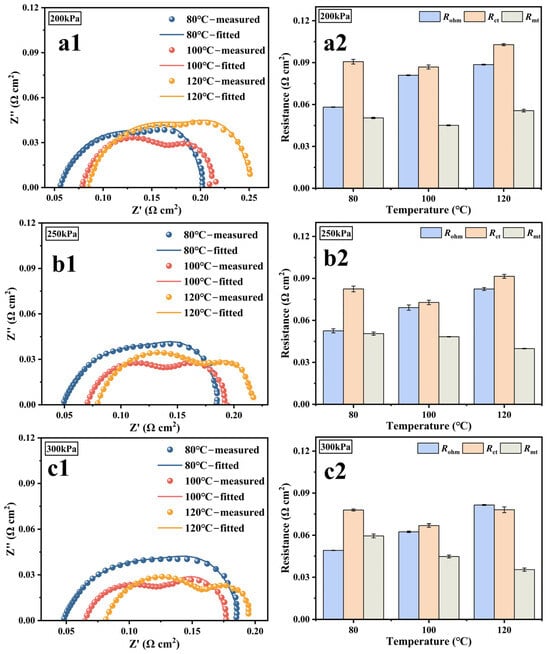 Under the conditions of 43% RH, 80/100/120 °C, and 200/250/300 kPa back pressures, respectively, the (a1–c1) EIS and their fitted curves and (a2–c2) the area resistance values of the , , and at 0.65 V.