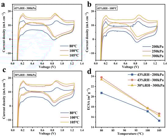 The CV curves at 1325 mL∙min−1 pure H2 on the anode and 3000 mL∙min−1 N2 on the cathode under different operating conditions: (a) 300 kPa and 43% RH at 80/100/105 °C; (b) 100 °C and 43% RH at 200/250/300 kPa back pressures; and (c) 300 kPa and 30% RH at 85/100/105 °C. (d) ECSA calculated values.