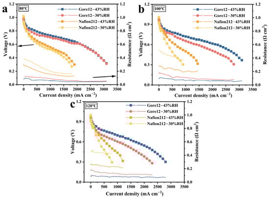 At 300 kPa back pressure, polarization and HFR curves of cells composed of Gore12 and Nafion212 under 30%/43% RH and temperatures of (a) 80 °C, (b) 100 °C, and (c) 120 °C.